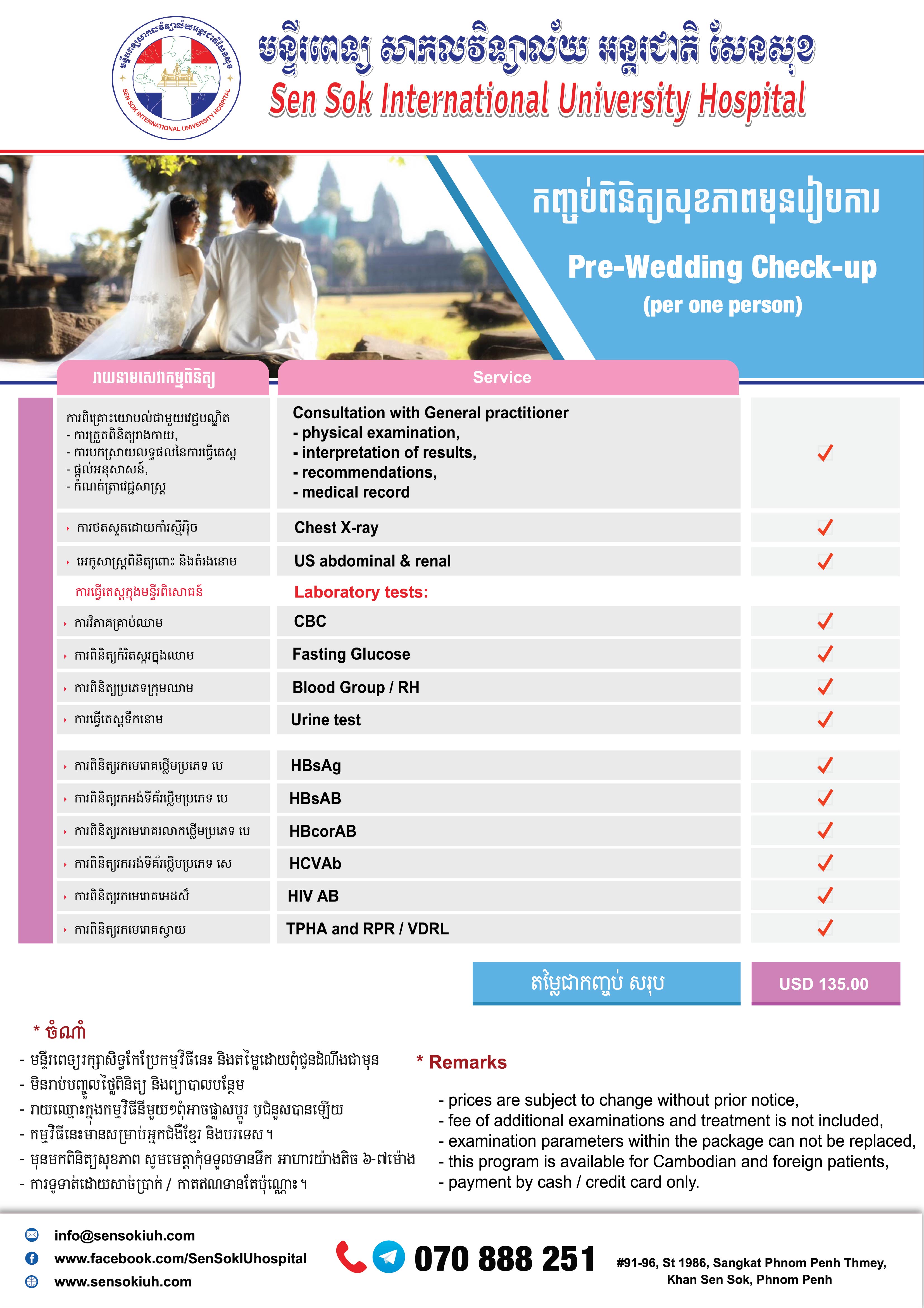 កក់ឥឡូវចាប់ផ្តើមជីវិតអាពាហ៍ពិពាហ៍ប្រកបដោយភាពជឿជាក់ និងសុភមង្គល។ កញ្ចប់នេះជួយឱ្យគូស្វាមីភរិយាថ្មីថ្មោង យល់ដឹងពីសុខភាពបន្តពូជ និងការពារការចម្លងជំងឺផ្សេងៗ ទៅកាន់មនុស្សជាទីស្រឡាញ់ និងបុត្រធីតាក្នុងអនាគត។