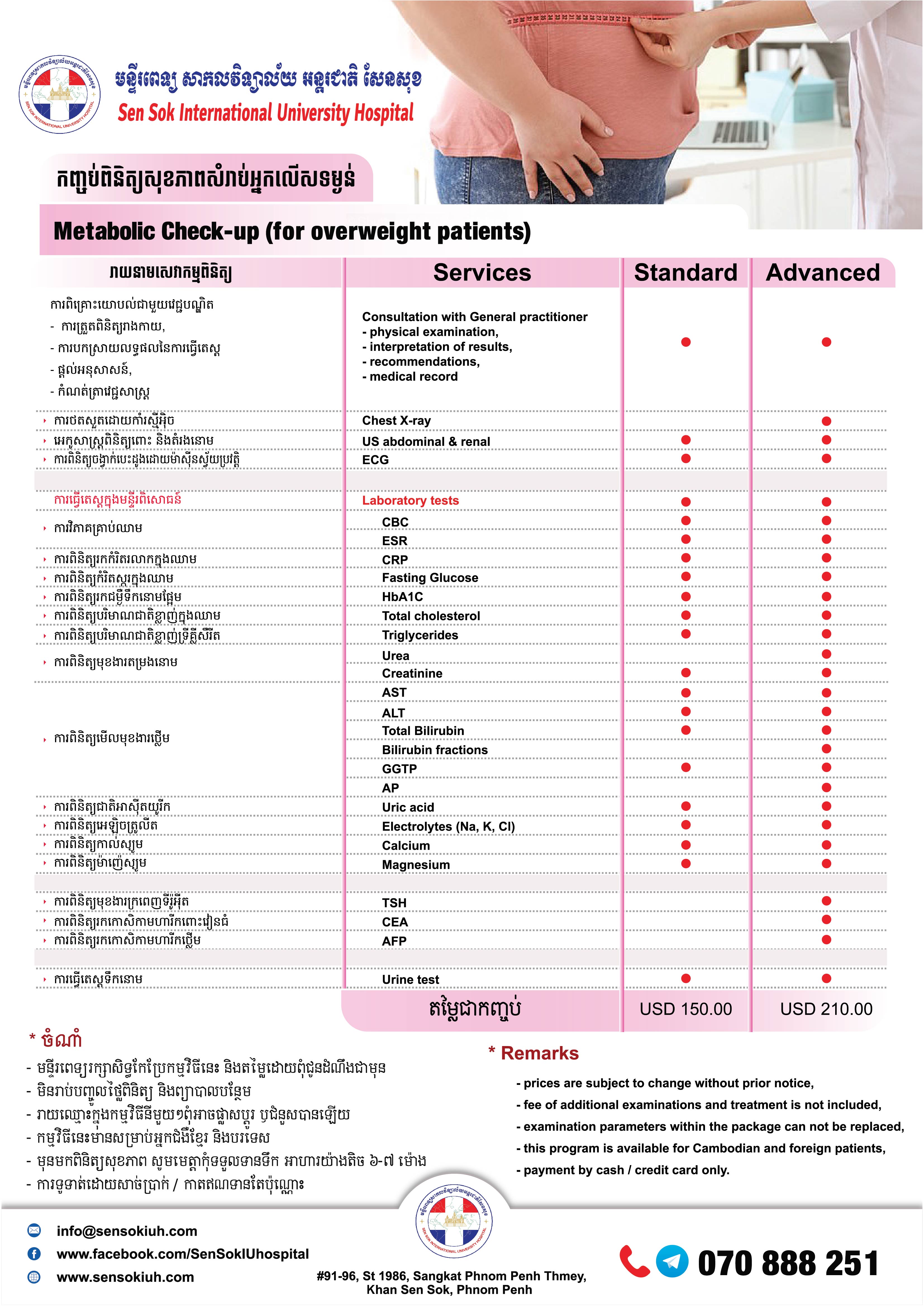 កក់ឥឡូវគ្រប់គ្រងសុខភាពឱ្យបានល្អ ទោះបីជាអ្នកមានបញ្ហាលើសទម្ងន់។ កញ្ចប់នេះផ្ដោតសំខាន់លើការពិនិត្យប្រព័ន្ធមេតាបូលីស ជាតិស្ករក្នុងឈាម និងមុខងារបេះដូង ដើម្បីការពារហានិភ័យនៃជំងឺទឹកនោមផ្អែម និងជំងឺសរសៃឈាមបេះដូង។