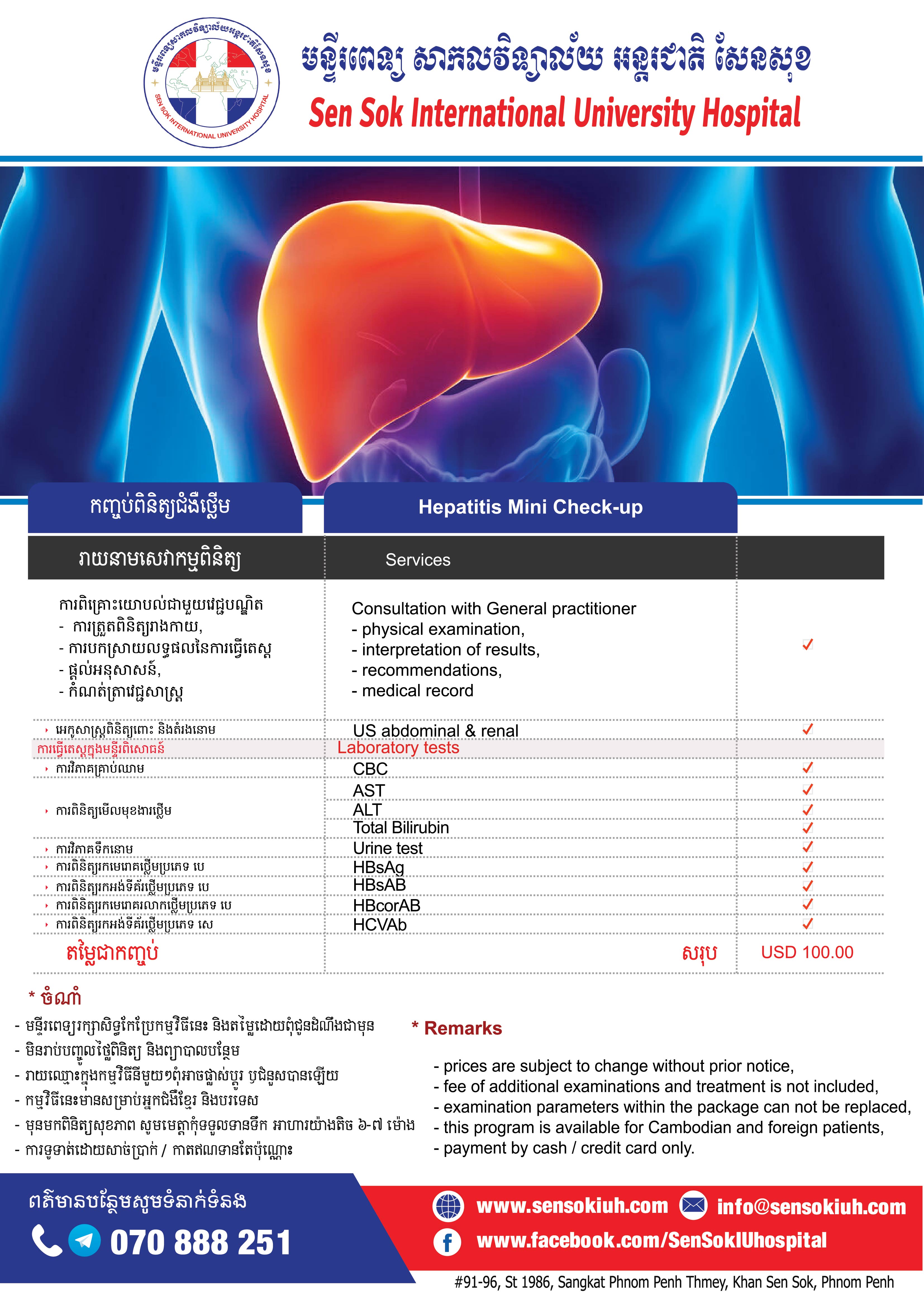ការការពារប្រសើរជាងការព្យាបាល។ កញ្ចប់ពិនិត្យសុខភាពទូទៅរបស់យើង ត្រូវបានរចនាឡើងយ៉ាងយកចិត្តទុកដាក់ ដើម្បីផ្តល់ជូនអ្នកនូវរូបភាពច្បាស់លាស់អំពីស្ថានភាពសុខភាពបច្ចុប្បន្ន ចាប់ពីមុខងារសរីរាង្គសំខាន់ៗ រហូតដល់ការស្វែងរកហានិភ័យនៃជំងឺផ្សេងៗដែលមិនទាន់ចេញរោគសញ្ញា។